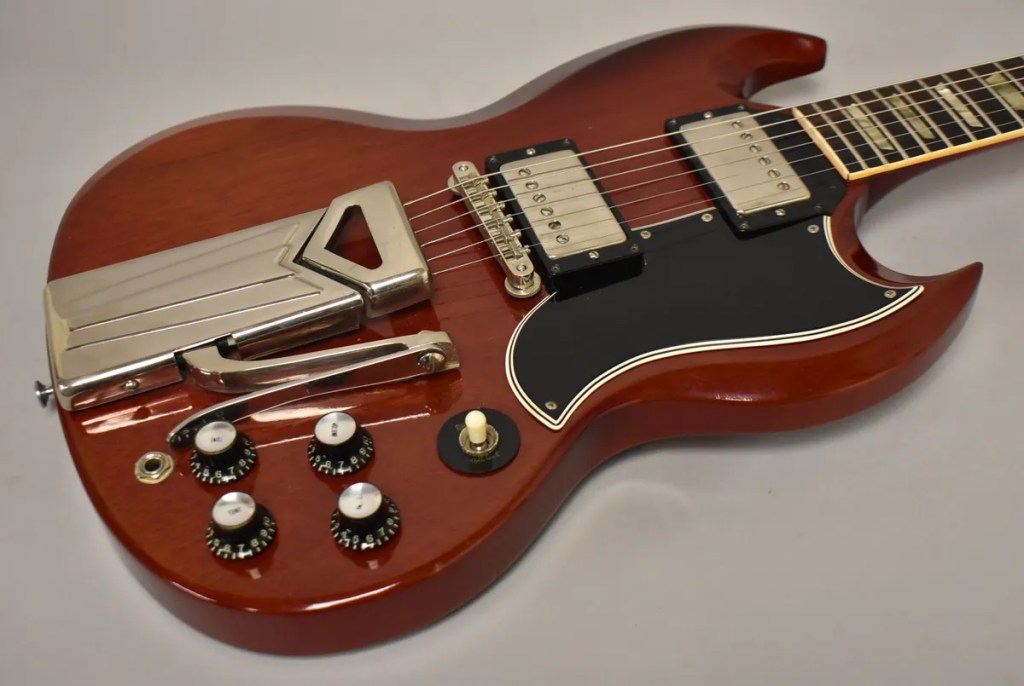 Up next is the Sideways Vibrola. These are one of the more unusual vibrato systems used by Gibson. Introduced in 1961, it featured a unique mechanism where the vibrato arm moves sideways rather than up and down. Also a spring-loaded device, this design was meant to offer a smoother vibrato effect but was often criticized for being difficult to use and for not holding tune well. It appeared on early 1960s models of the SG (then known as the new “Les Paul”, such as the Standard and Custom. But due to its unpopularity and mechanical issues, it was phased out relatively quickly, making guitars equipped with this vibrato system rare and collectible today. While they might not be the most reliable, they sure are pretty!